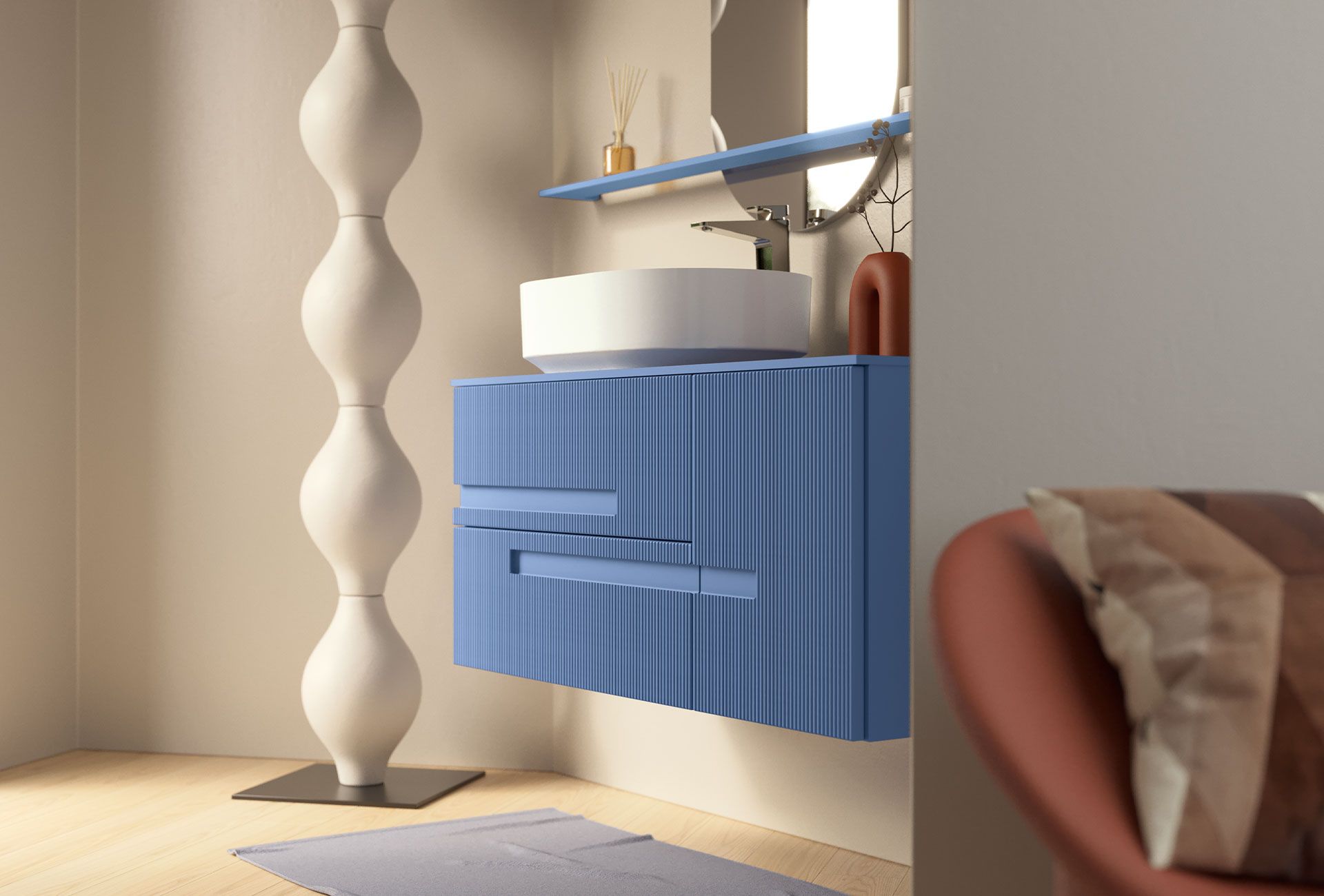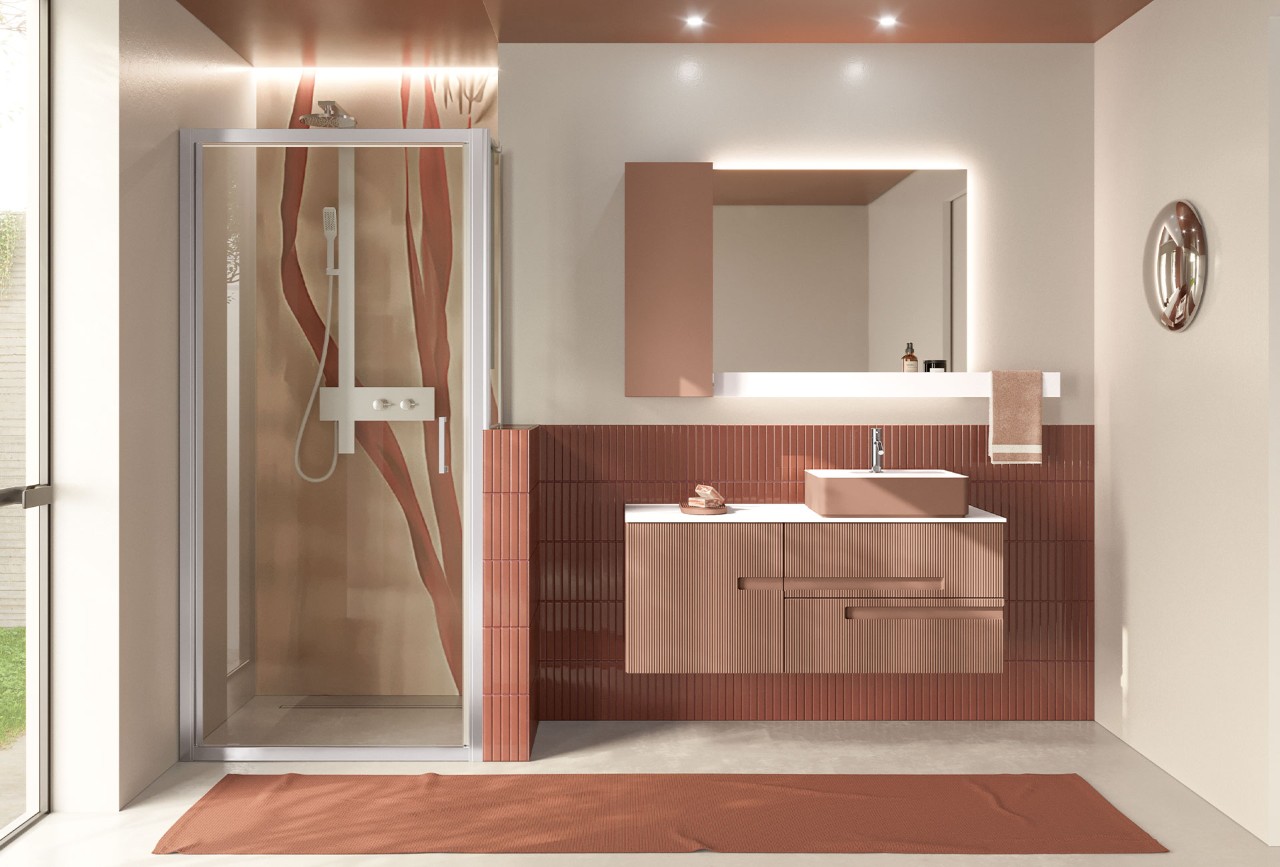 Track series is designed to offer the perfect balance between functionality, aesthetics, and affordability. Its minimalist design is distinguished by the ribbed door with an integrated handle—a detail designed by Marco Pellici that creates visual rhythm and a sophisticated tactile experience, highlighting the purity of the lines and the clean, minimalist form of the entire piece.