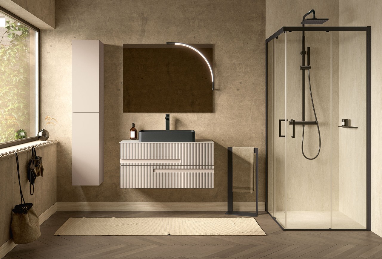 Track series is designed to offer the perfect balance between functionality, aesthetics, and affordability. Its minimalist design is distinguished by the ribbed door with an integrated handle—a detail designed by Marco Pellici that creates visual rhythm and a sophisticated tactile experience, highlighting the purity of the lines and the clean, minimalist form of the entire piece.