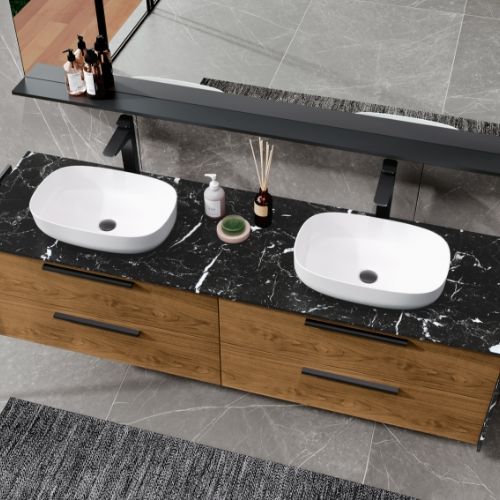 FIVE/R3 countertop washbasins in matt white mineralsolid and D single lever mixer in matt black