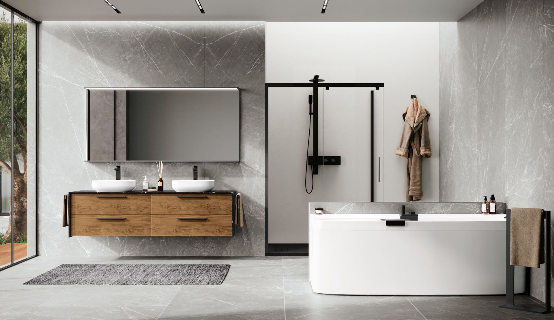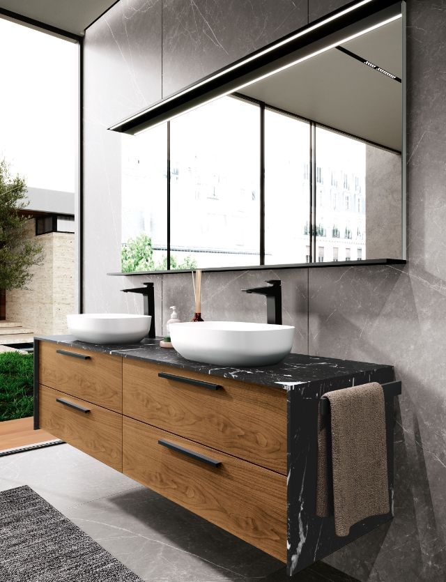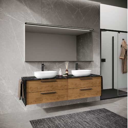The Cover collection is a form of modern material minimalism. The finishes applied to the architecture break down the spaces into different dimensions. The wood finishes, an expression of Iotti by Novellini's profound awareness of the processing of materials, narrate the products. The tailoring of the profiles becomes a trait d'union between the various objects that complete the spaces, defining them as environments.