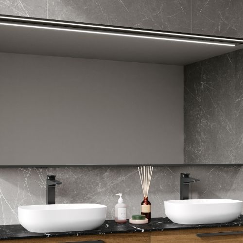 Mirror with lower and upper shelf in matt black painted aluminium and integrated LED lighting