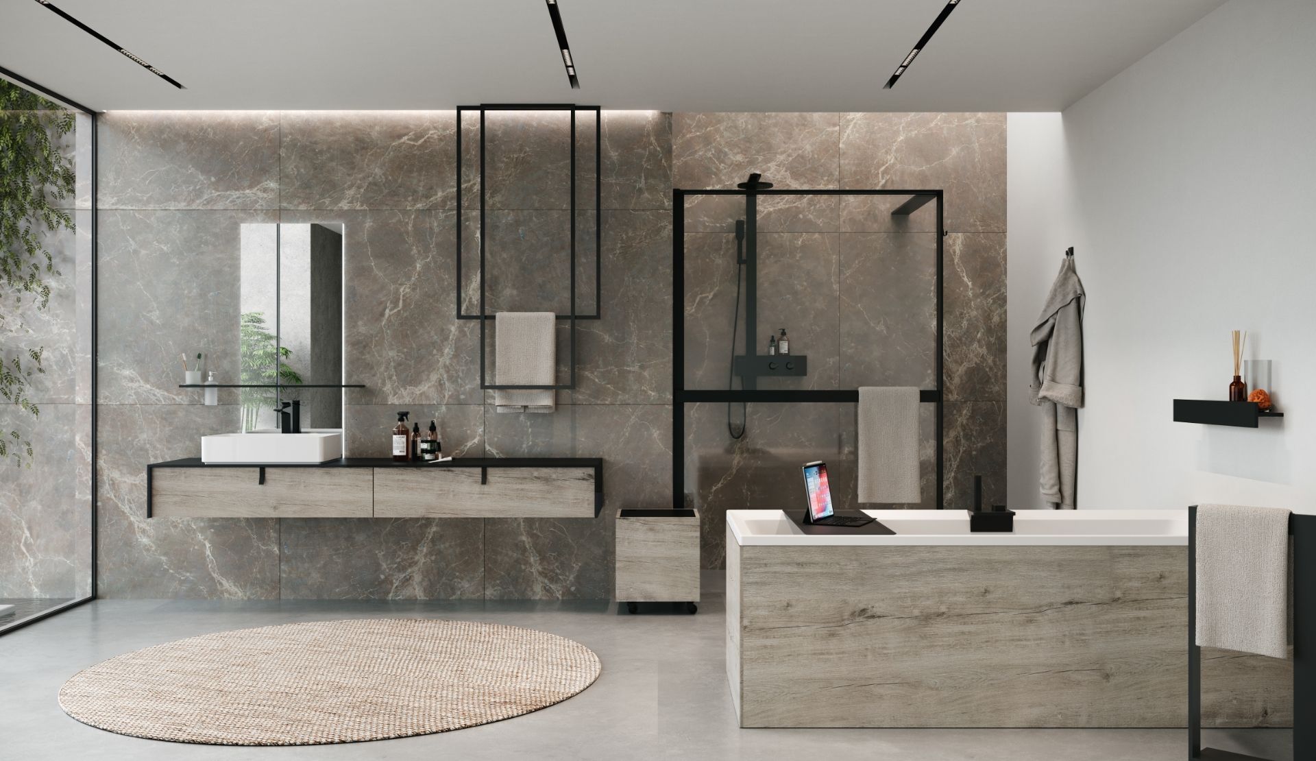 LED backlit mirror with FRAME shelf in matt black painted aluminium
