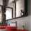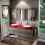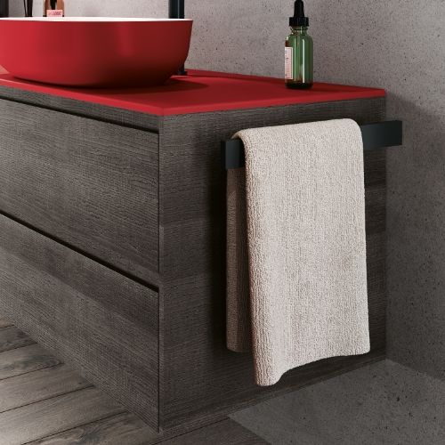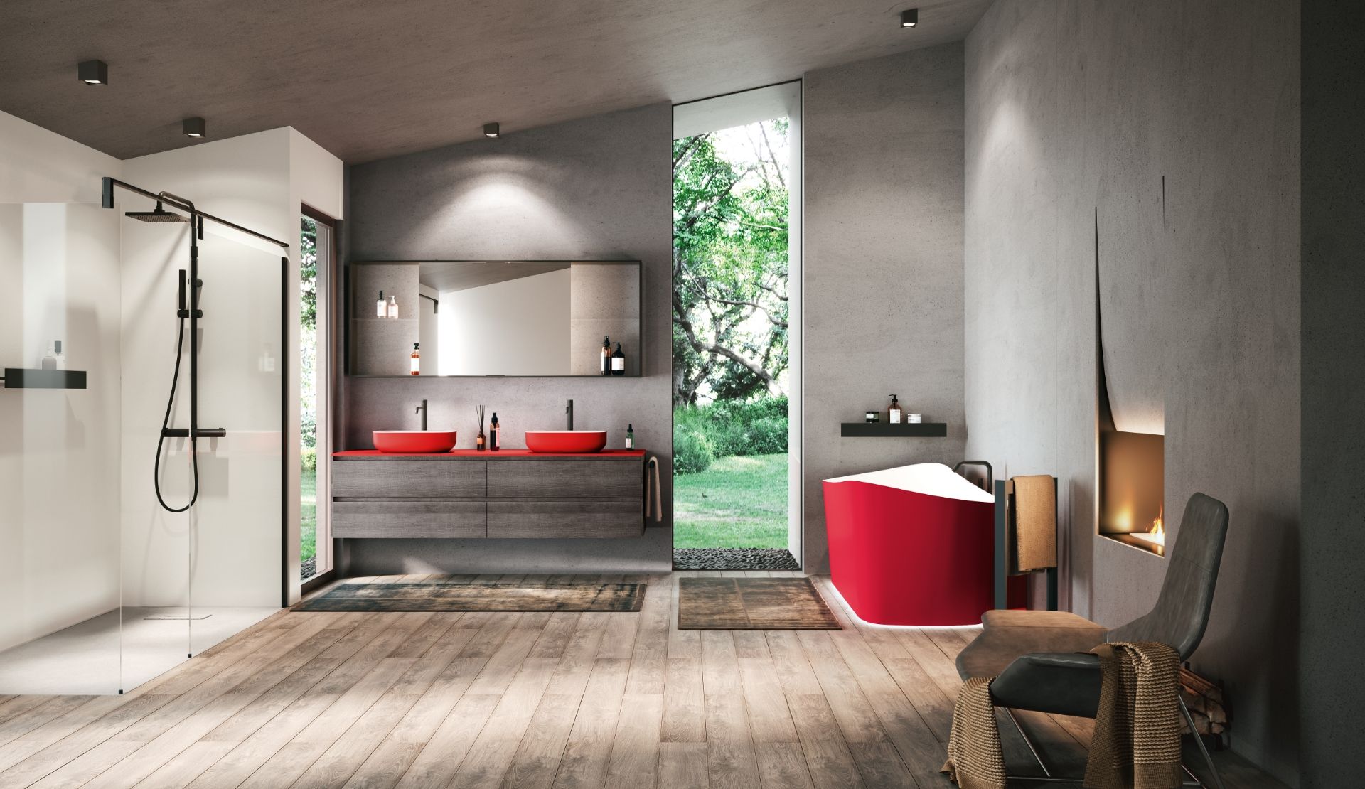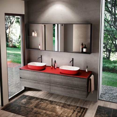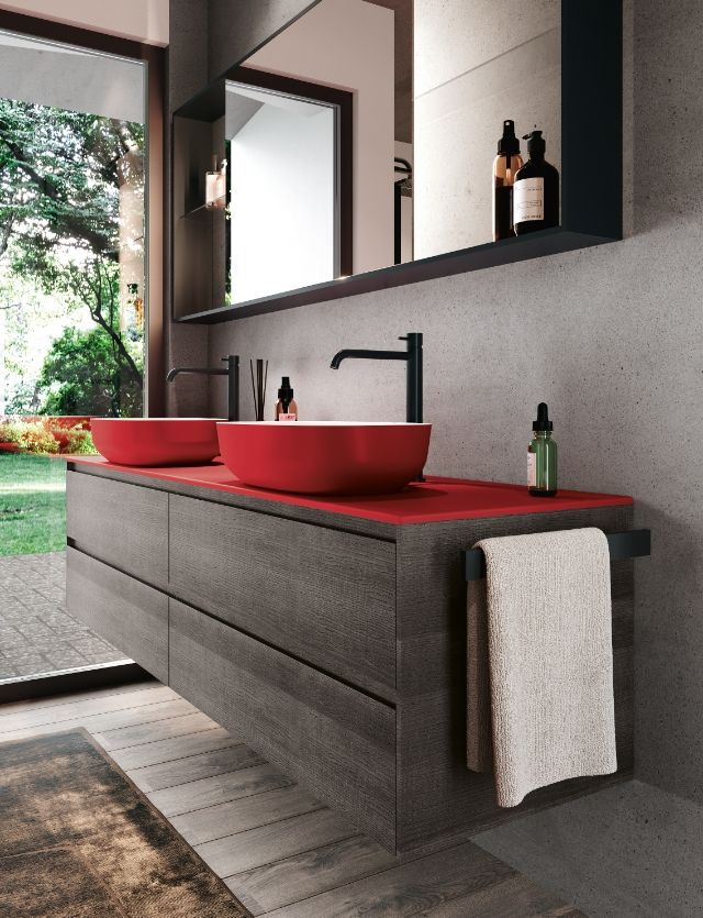 RE05 composition with matt Rubino lacquered top with FIVE/R2 countertop washbasins in matt white Solidsurface externally lacquered in matt Rubino and FLY 3 single lever mixer in matt black